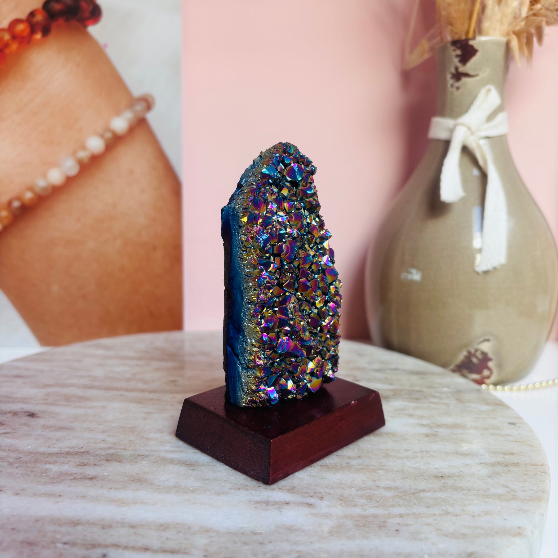 Deze amethist is een echte showstopper! Het is een regenboog aura kristal met een prachtige, gekleurde tint, behandeld met een goudinfusie. Door een innovatief proces waarbij gouddamp aan het kristal wordt toegevoegd in een vacuümkamer, krijgt de oppervlakte een unieke metaalglans. Deze behandeling verandert het kristal permanent, waardoor het een krachtige aura cleaner wordt. Het verhoogt de vibratie, stoot negatieve emoties en invloeden af en biedt goede bescherming. Het versterkt je zelfvertrouwen en haalt het beste in jezelf naar boven. Elke steen is uniek, met zijn eigen vorm, kleur en karakter, en kan daarom oneffenheden bevatten.