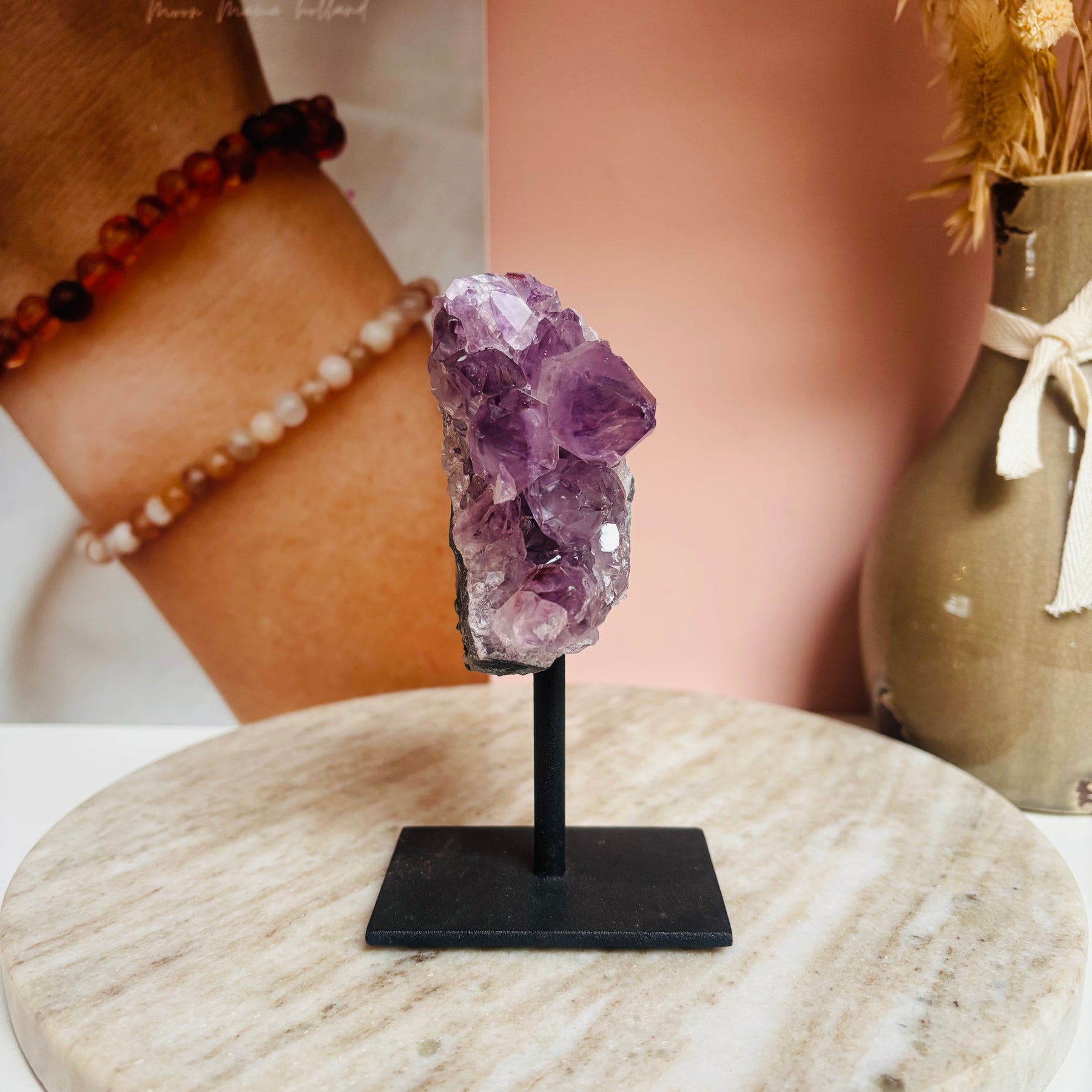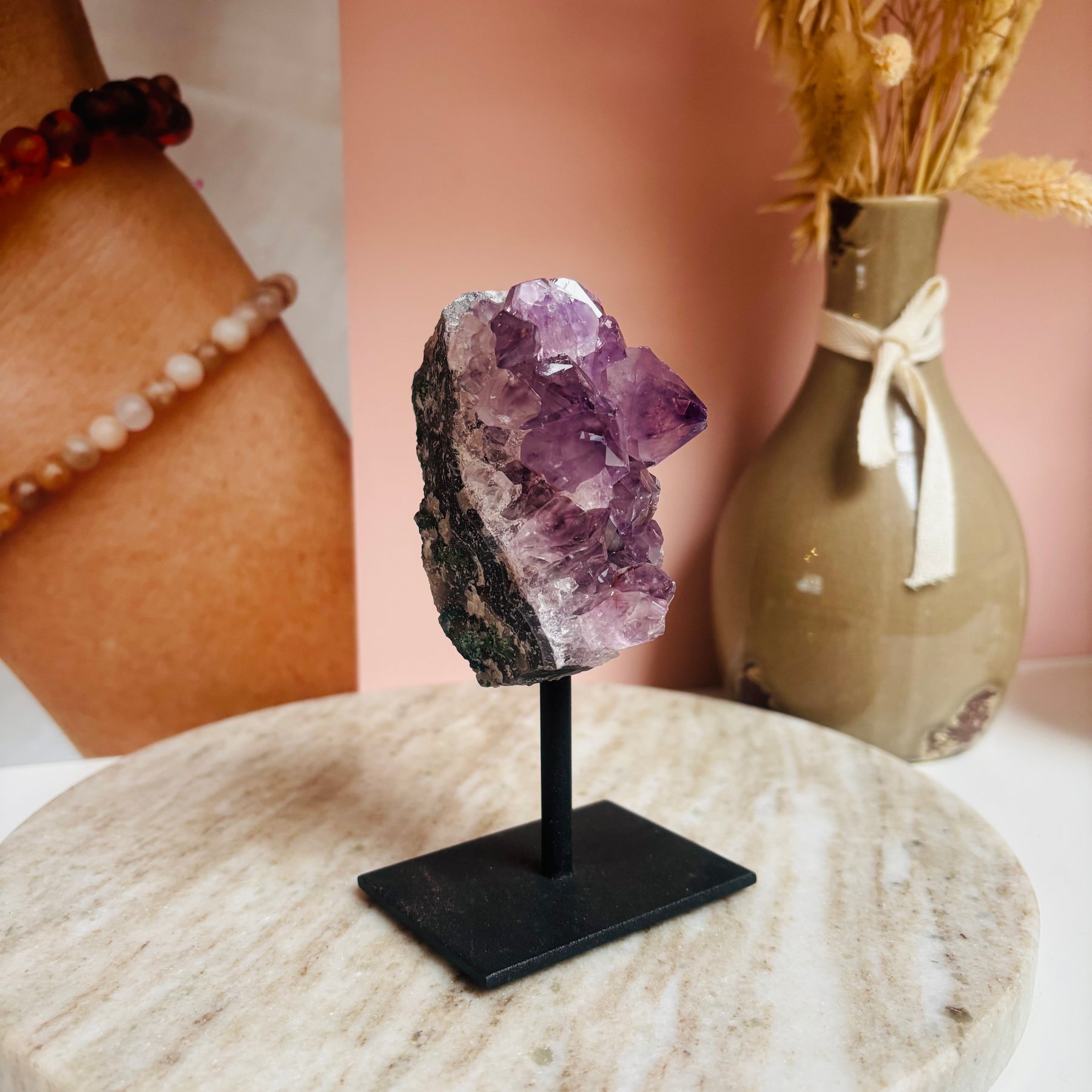 Straalt vrede en pure rust uit. Het zorgt voor een lichter hoofd, zowel in minder hoofdpijn, als minder gedachten. Werkt zuiverend en beschermend. Deze steen zal je gevoelens op een rijtje zetten en je hiermee helpen bij emoties, trauma’s en bijzondere momenten. Amethist zorgt voor een fijne nachtrust. Helpt bij het inslapen en doorslapen. En verminderd nachtmerries.