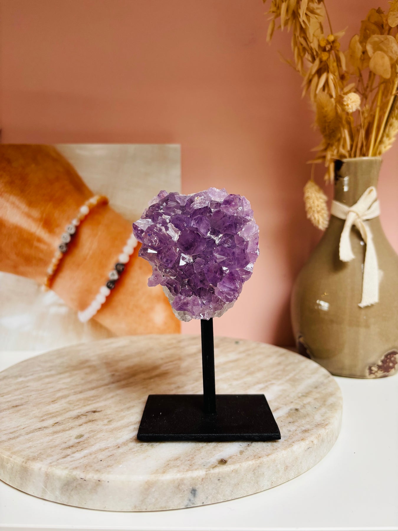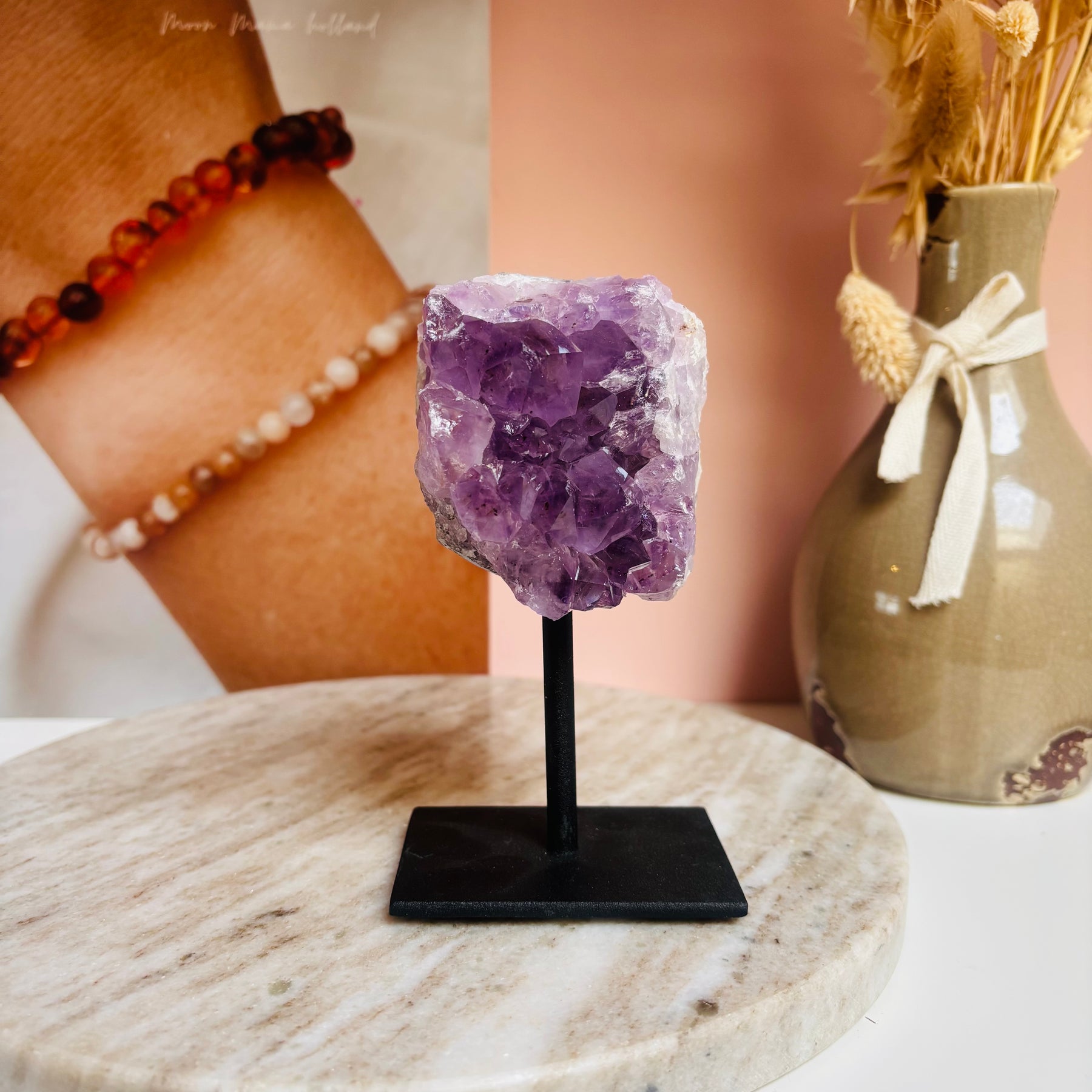 Straalt vrede en pure rust uit. Het zorgt voor een lichter hoofd, zowel in minder hoofdpijn, als minder gedachten. Werkt zuiverend en beschermend. Deze steen zal je gevoelens op een rijtje zetten en je hiermee helpen bij emoties, trauma’s en bijzondere momenten. Amethist zorgt voor een fijne nachtrust. Helpt bij het inslapen en doorslapen. En verminderd nachtmerries.