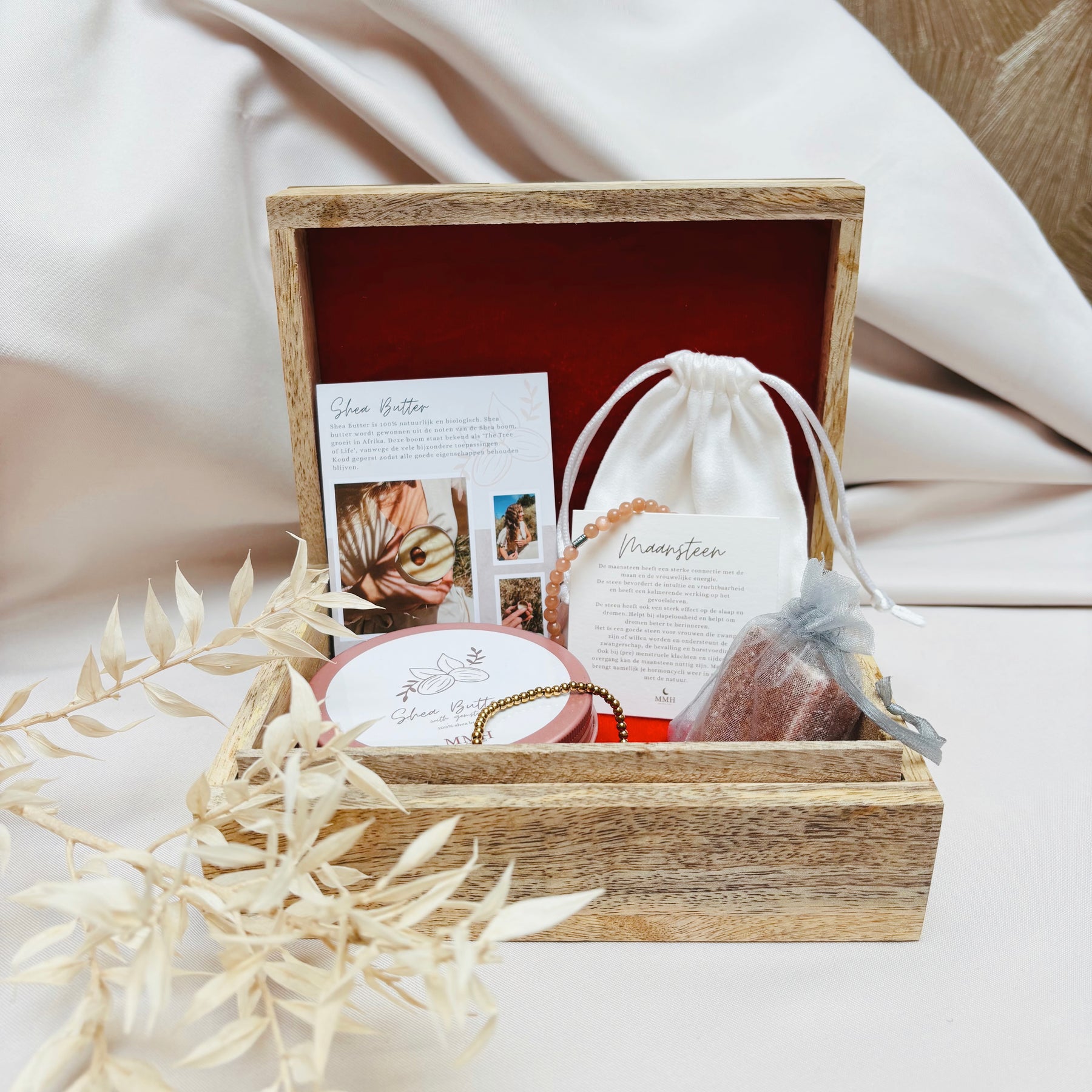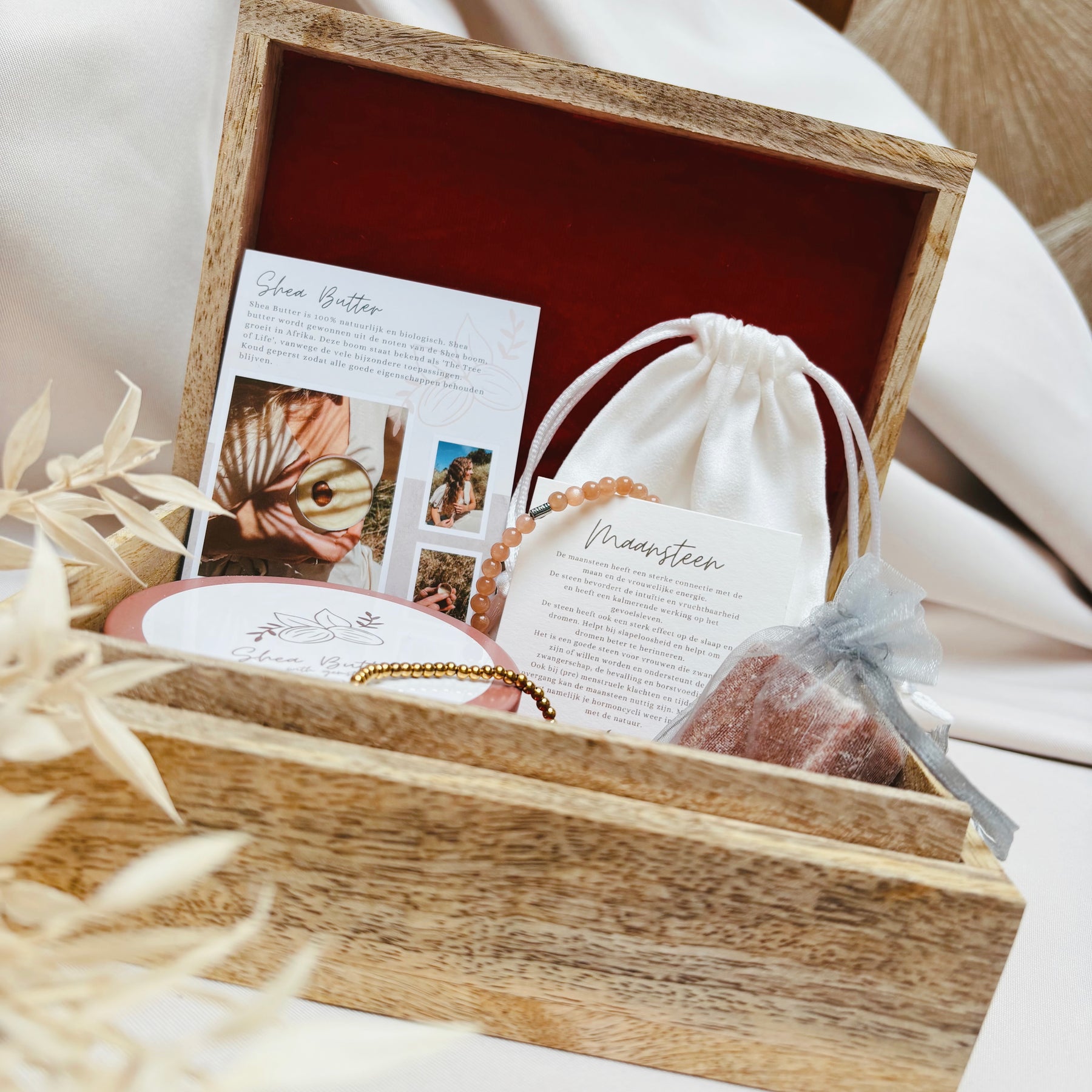 Deze innerlijke kracht giftset bestaat uit houten sieraden kistje en een maansteen armband, goud of zilver armbandje, een 100% shea butter zalf met edelsteen en een amber geurblokje voor in huis.