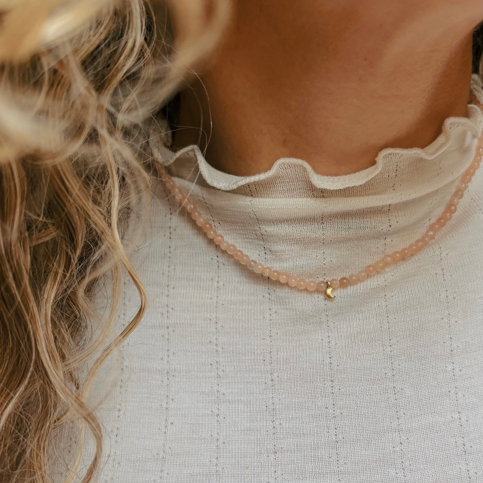 Elke kleine kraal is zorgvuldig geselecteerd maansteen, een steen die al eeuwenlang wordt verbonden met de maan, de cyclus van het vrouw-zijn en de kracht van zachte, intuïtieve flow. Het subtiele maantje geeft dit kettinkje een spirituele en dromerige touch.